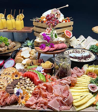 Wooden stands, boards and trays bring neutral tones to your event space and are perfect for a grazing bar set up.